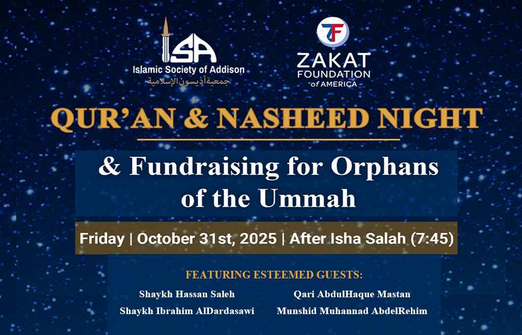 Join us for an evening of beautiful recitations, soulful nasheeds, and compassion in action with some World-Renowned Reciters as we raise support for orphans of the Ummah.